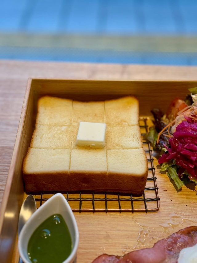 モーニングプレートは、トースト、サラダ、ベーコンエッグが木のボックスに入っています。