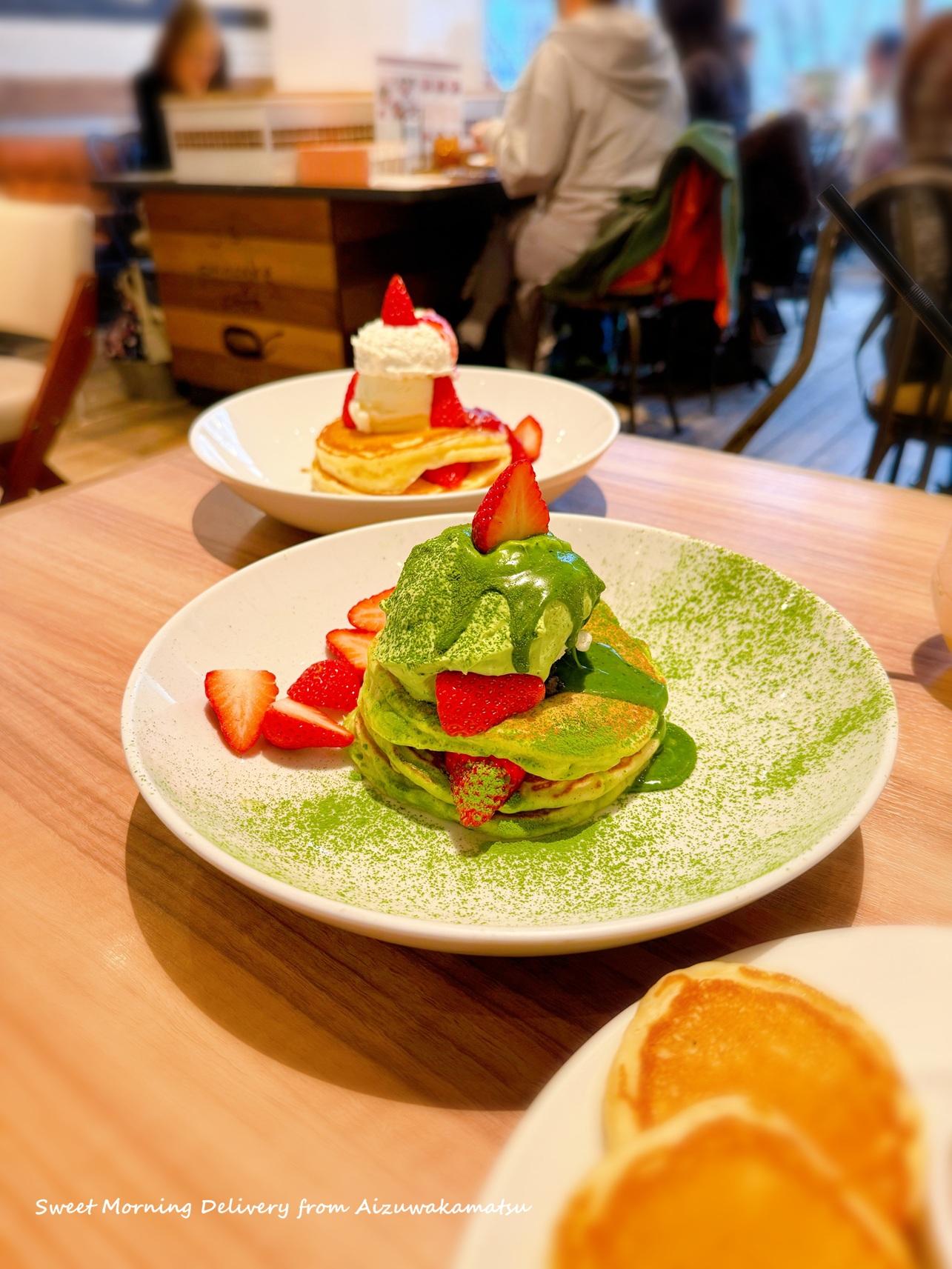 旅先でふらっと入ったカフェで見かけたこの【天空の抹茶】を使用したという「プレミアム抹茶ストロベリーパンケーキ」