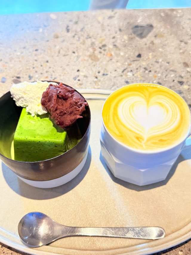 さらにさらに、、「出席中です」と掲げられていた抹茶ババロアがどうしても気になって、そちらもいただき。あとハートがかわいかったのでカフェラテを。