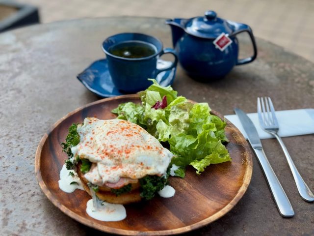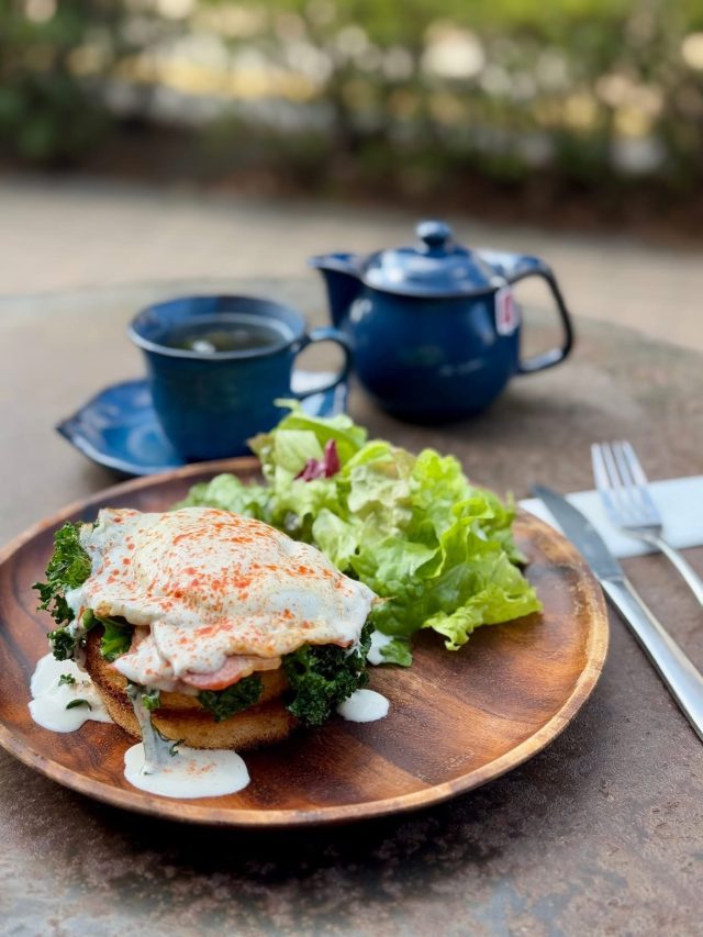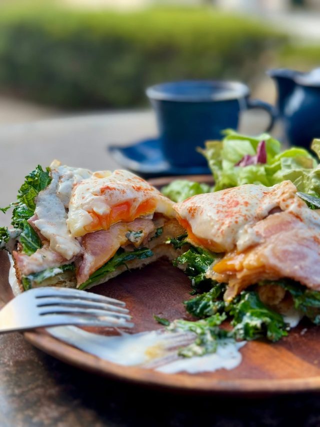 トーストにケール、ベーコン、目玉焼きが重なり、カシューナッツソースが包みます。
