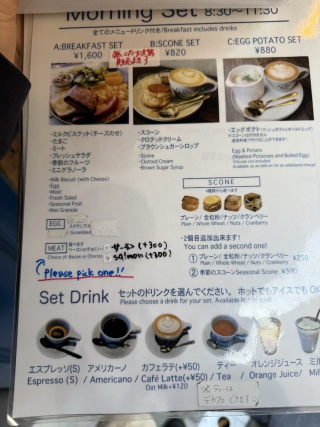 モーニングセットは、BREAKFAST SET、SCONE SET、EGG POTATO SETの3種類。どれにしようか迷いますが、BREAKFAST SETにしてみました。