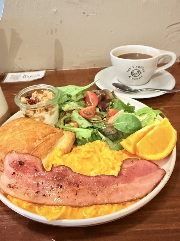 スクランブルエッグ、私がセレクトしたベーコン、ベーコンサラダ、グラノーラがたっぷり入ったヨーグルト、そしてスコーン!
