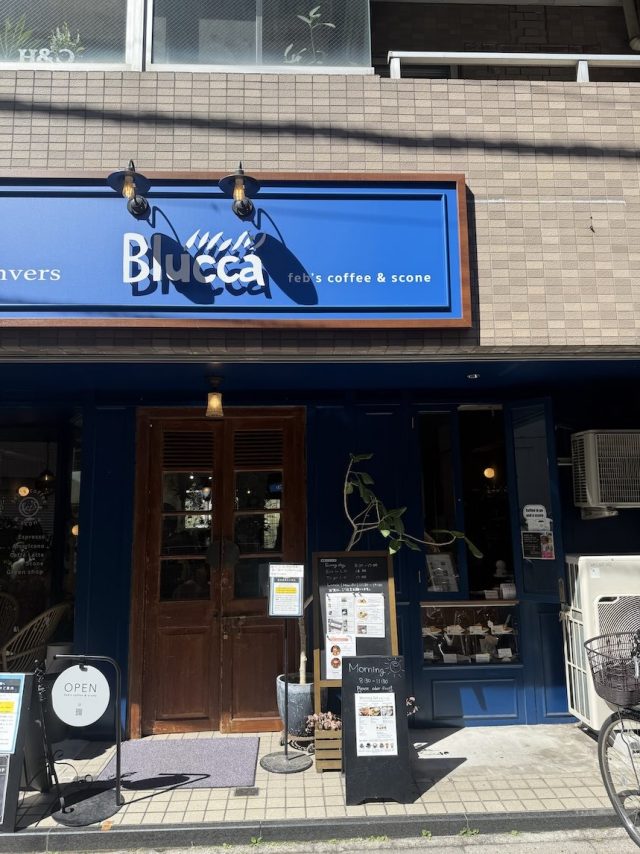 今日は桜の名所隅田川も近い蔵前のモーニングをご紹介。feb’s coffee&scone Blucca店です。朝から行列ができてます。ロイヤルブルーの外観がとっても美しい。