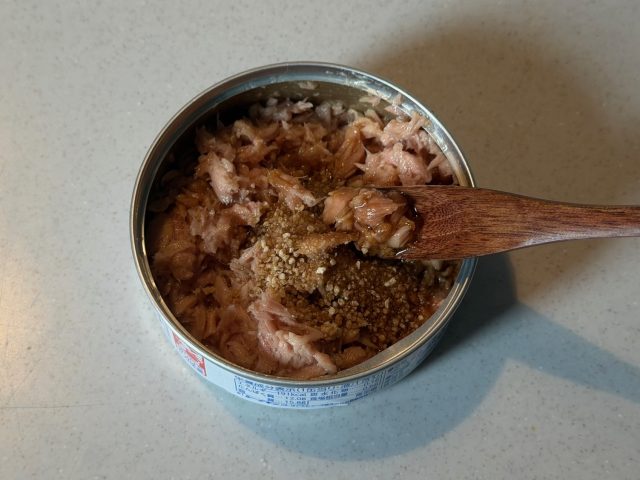 【1】ツナ缶の油をしっかりときり、しょうゆと砂糖を入れて混ぜ合わせる。