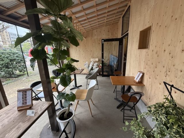 私は目の前の公園を見渡せるテラス席に着席。全体的にナチュラルカラーの木目が優しい感じ。