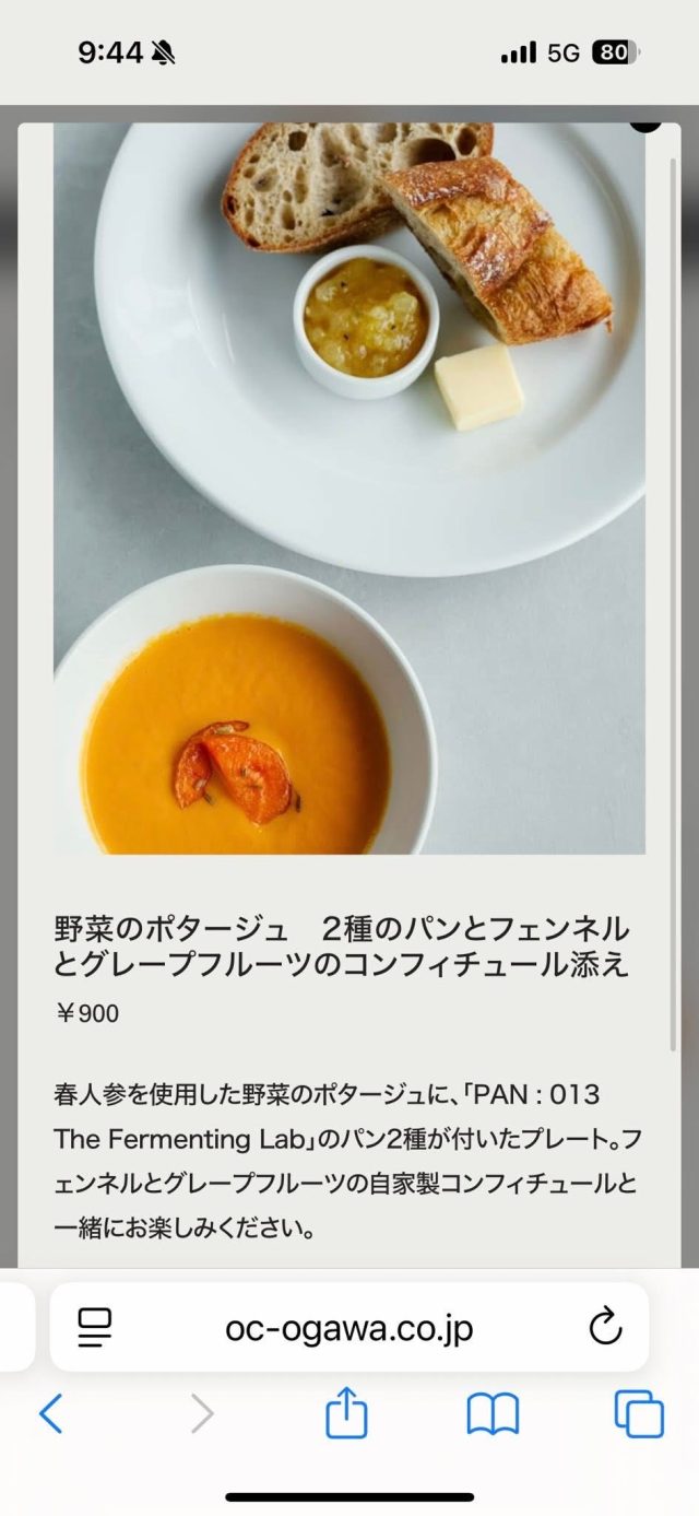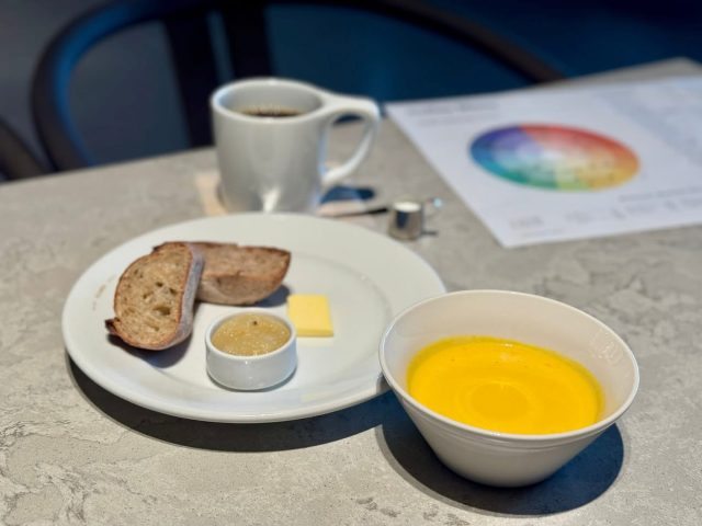 私は、ショーケースの中にあったパンと、モーニングメニューからポタージュとパンのセットをオーダーしました。