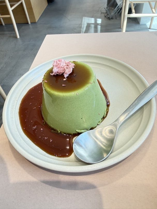 抹茶プリンをいただき。上には塩漬け桜が乗っていて春を感じます。濃厚抹茶プリンでした。