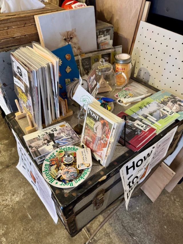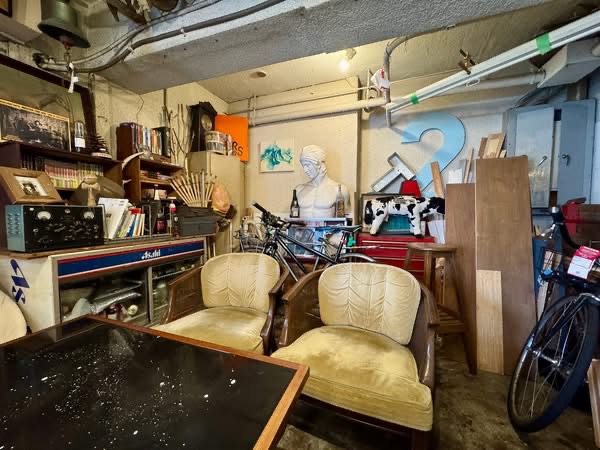 倉庫内にはアンティークの家具や木彫りのクマ、石膏像、漫画、自転車、工具など、バラバラのテイストのモノが集まっていますが、なんだかワクワクするような空間。