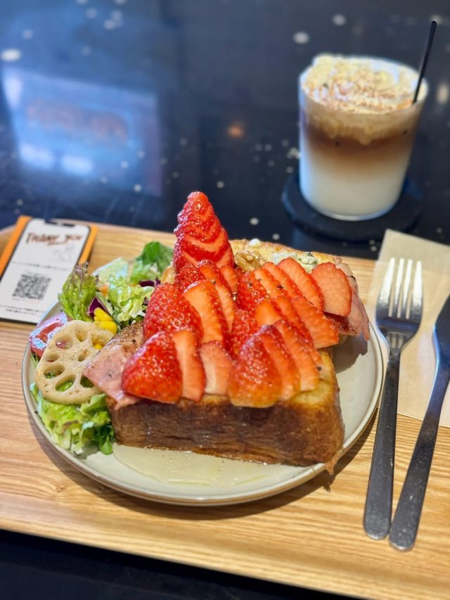 分厚いトーストに、山盛りの苺!