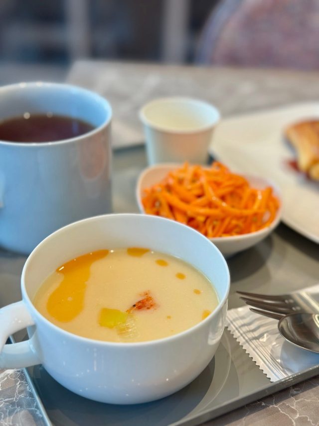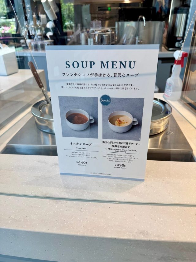 この日のスープは「オニオンスープ」と、「新玉ねぎとポロ葱の豆乳ポタージュ 桜海老を添えて」の2種類。