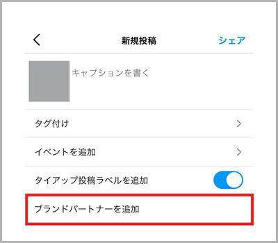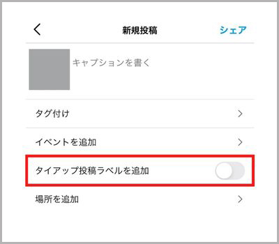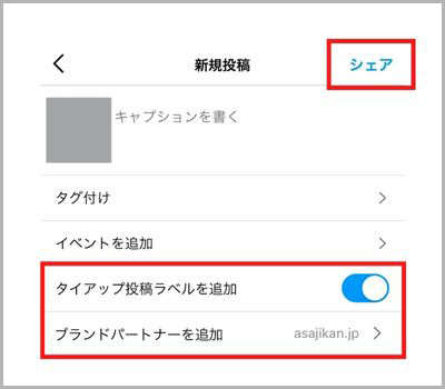 6.タイアップ投稿ラベルを追加がONになっているか確認しシェア(投稿)する