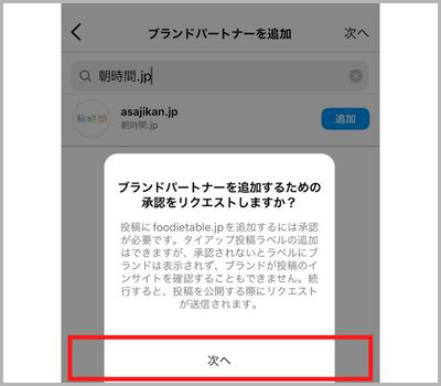 Instagramでは、有償・無償に拘わらず、商品やサービスを告知する意図をもった投稿に対して「タイアップ投稿ラベル」をつけることがルールとなっています。朝時間.jpの企画においてもご投稿の際にはブランドパートナーとして「@asajikan.jp」を追加してください。